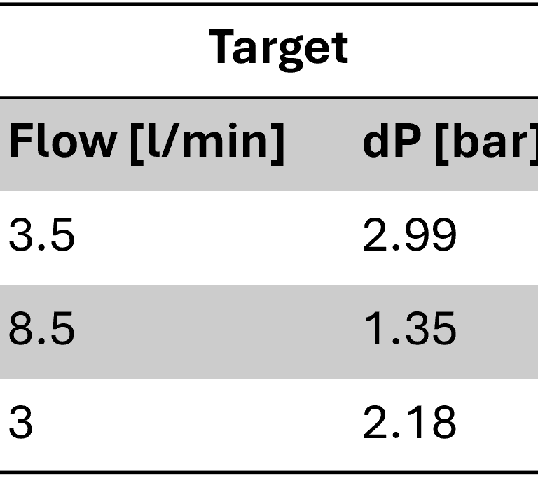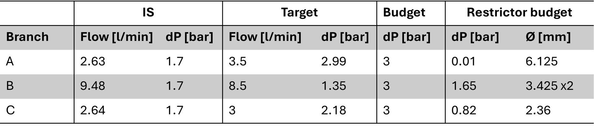 Using this baseline, the pressure drop at the desired target flow rate is then estimated for each branch using the equation given below. The branch exhibiting the highest pressure drop defines the limiting hydraulic condition of the system (Table 1 - Target). Based on this constraint, the available pressure budget for additional flow restrictors is determined and restrictior dimentions can be determined with some pressure drop calculator (Table 1 - Restictor Budget).