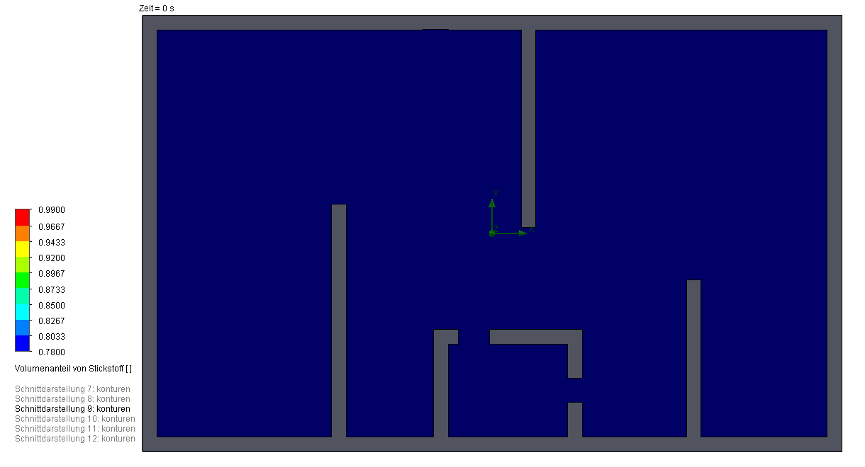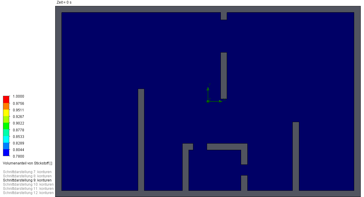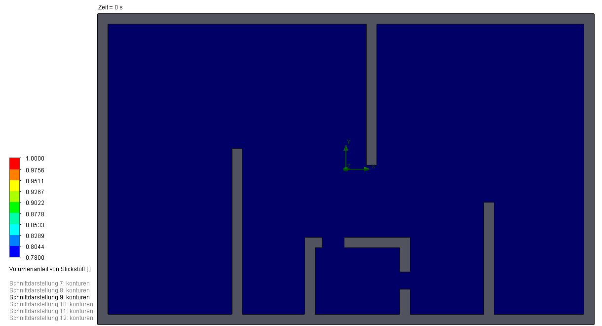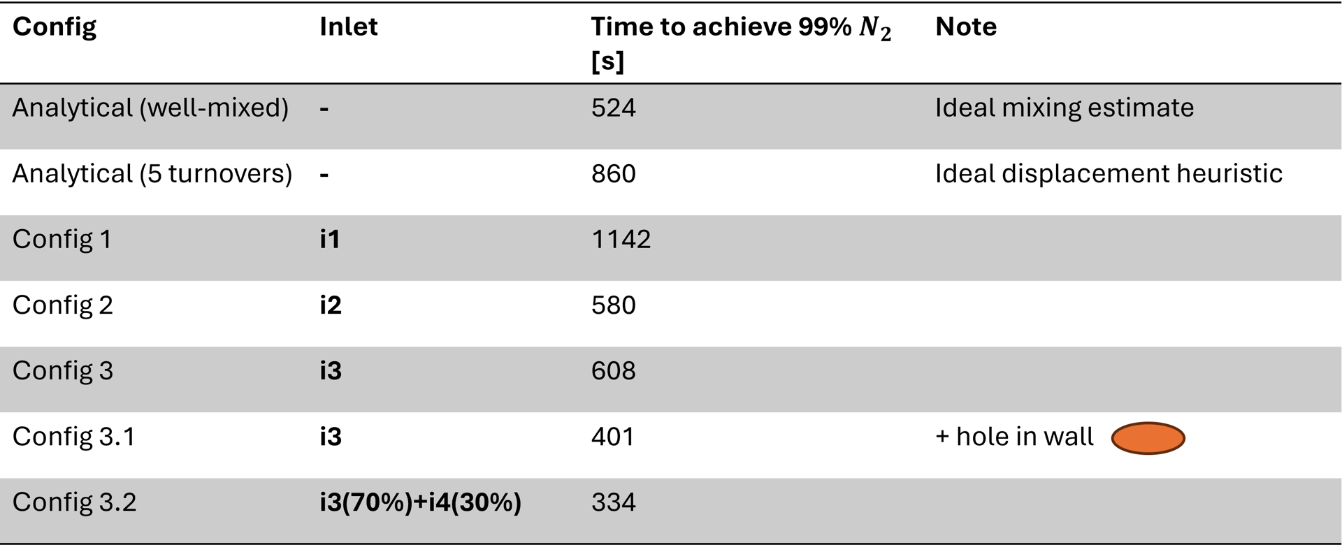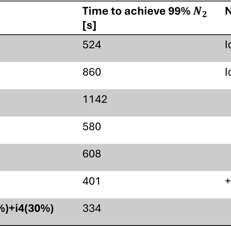 By observing the results in the table above we see the dependancy between inlet position and time to achieve 99% $N_2$ concentration. With Config 1 there is a short-circuit between the inlet and the outlet so that left cammer of the module is not flooded properly which in terms results to very high purging time (Image 4). Contrary to that in Config 2 the inlet jet hits the opposite wall and the half of the jet is guided to the left cammer. That leads to the faster purging times. Config 3 sweeps through and clears the volume being slightly slower than the analytical solution (Image 5). Now if the times to purge are still too high, on back of my head I can think of two quick fixes, than can reduce the purging time - Config 3.1 and Config 3.2.